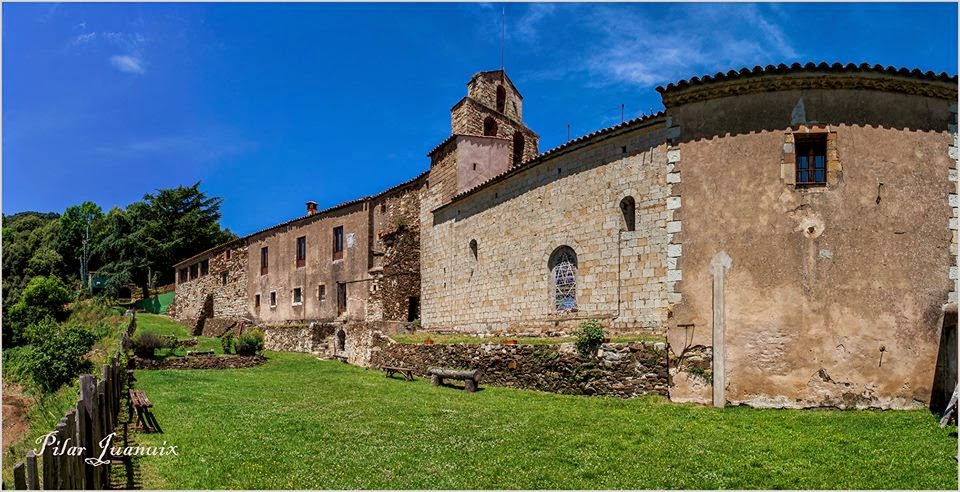 La Pilar Juanuix retratava el Santuari de la Mare de Déu del Coll que està situat a la banda nord de les Guilleries, a 823 metres d'altura, en el coll que uneix els massissos de Sant Benet i Sant Gregori, prop del Coll de Nafrè, pas tradicional entre les valls d'Osor i Susqueda. Això el converteix en un mirador excel•lent, des d'on podem divisar l'embassament de Susqueda, els cingles del Far, la vall d'Osor, el massís de Solterra i la serra de Santa Creu. Se situa al límit dels termes de Susqueda i Osor de manera que l'església i l'antiga casa prioral són al municipi d'Osor i l'hostaleria i la plaça al de Susqueda. El Santuari està estructurat en base tres elements físics: en primer lloc l'església. De l'antic priorat benedictí resten algunes parets de la casa prioral i, sobretot, l'edifici de l'església, conservat gairebé intacte. Es tracta d'una església d'una sola nau rectangular d'uns 20 metres de llarg, capçada a llevant per un absis semicircular. La nau no és perfectament rectangular, ja que es va tancant des de ponent fins a trobar-se amb l'absis a llevant, després de perdre gairebé 1 metre d'amplada. Les façanes són llises, sense decoració escultural, llevat del ràfec de tres fileres - la primera de rajola plana i les dues restants de teula- que tanca la façana en la part superior. Al cim de la façana de ponent hi ha un campanar d'espadanya, alt i pesant, amb dos nivells d'ulls: en el nivell inferior hi ha dos ulls i en el superior tant sols un. Ara bé, en els dos nivells no hi ha campanes. L'aparell és format per uns carreus no gaire grossos, però molt ben tallats i escairats, amb unes juntes ben estretes. Pel que fa als espais i acabats interiors, l'absis té una volta de quart d'esfera, però una mica apuntada, i la nau, una volta igualment apuntada a la unió amb l'absis. En el mur sud, prop de l'absis, s'obre una porta posterior a l'edifici, que dóna a una sagristia, únic element afegit, l'any 1893, a l'edifici inicial de l'església.